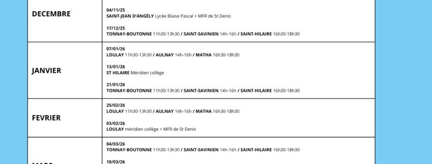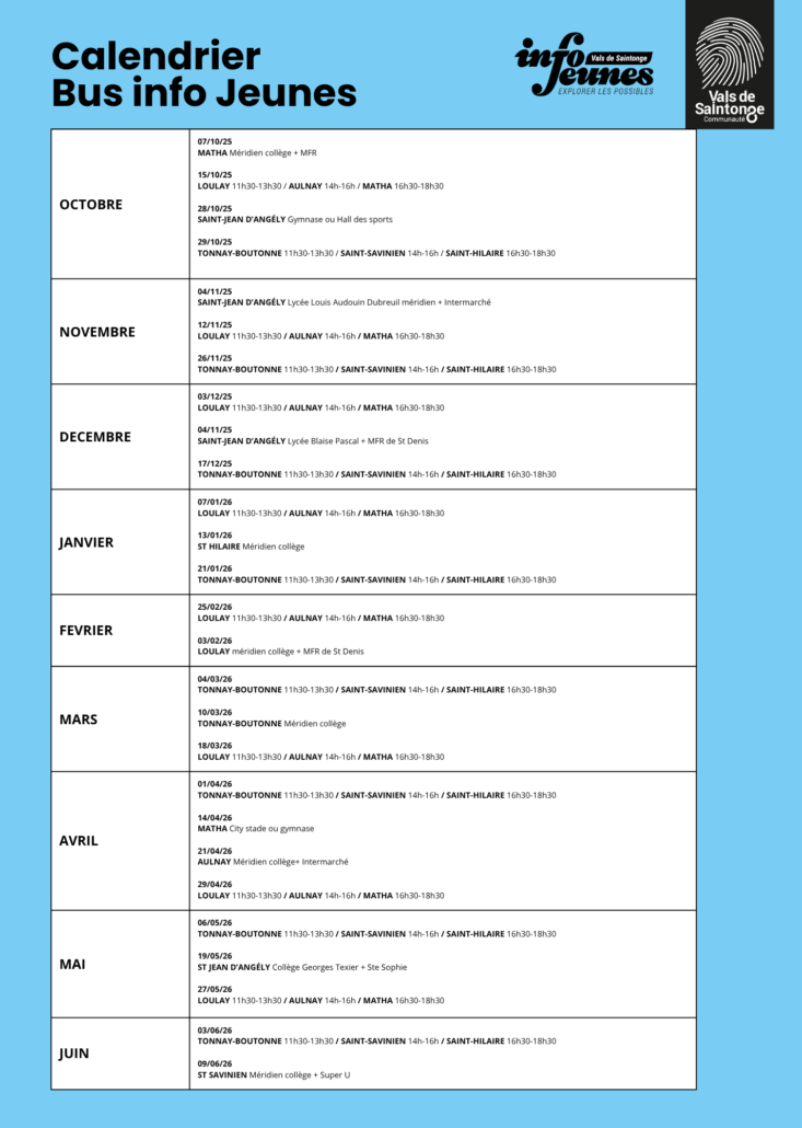 👀 Bus Info Jeunes : L'info' au coin de la rue Des jeunes de votre entourage se posent des questions ? Le bus Info Jeunes les informe au plus près de chez eux ! Ce service itinérant et gratuit est destiné aux 11-30 ans. Ils peuvent y monter à bord chaque mercredi dans différentes communes, mais aussi dans les établissements scolaires. 🚌 Les jeunes peuvent s'y informer sur différents sujets 👉 prévention, accompagnement dans leurs questions liées à la vie quotidienne, orientation, mobilité, santé, emploi, logement, loisirs, projets à l’étranger… Sillonner le territoire permet d'élargir le service Info Jeunes, qui accueille les jeunes du lundi au vendredi à Saint-Jean d'Angély, afin de le rendre encore plus accessible. Toutes les dates jusqu'en juin 2026 👇